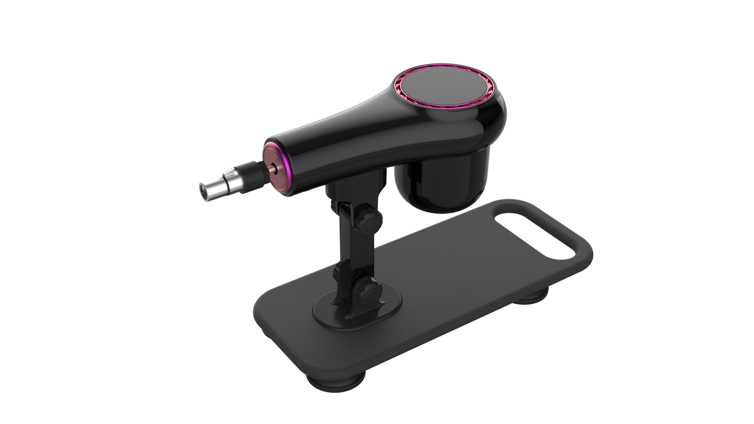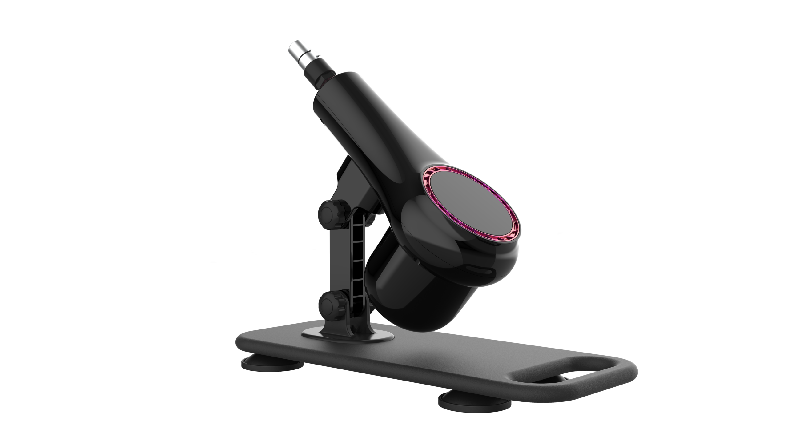 Alt bölümde bulunan güçlü sabit vantuz, fayans, cam gibi pürüzsüz yüzeylere sıkıca yapışarak titreşimi azaltır, stabil kullanım sağlar ve sessiz bir deneyim sunar. Sadece 1,9 kg ağırlığındaki ergonomik gövde; elde kullanım, sabit yüzey montajı veya partnerli oyunlar için oldukça pratiktir.