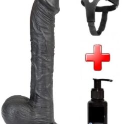 Evatoy 27 cm Siyah Realistik Vantuzlu Dildo Penis Kemer Kayganlaştırıcı Set